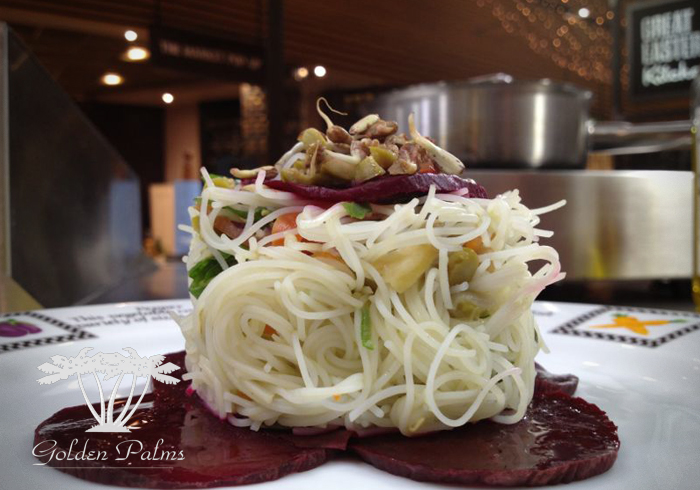 Taking 5 slices of beetroot from the plate drizzle them with olive oil and a little squeeze of lemon juice laying them out on the plate. Using the catering ring place it in the middle of the plate on top of the beetroot layer and spoon the noodle mixture within the ring, garnishing the top with the 5th slice of beetroot topped with alfalfa and organic sprouting beans.